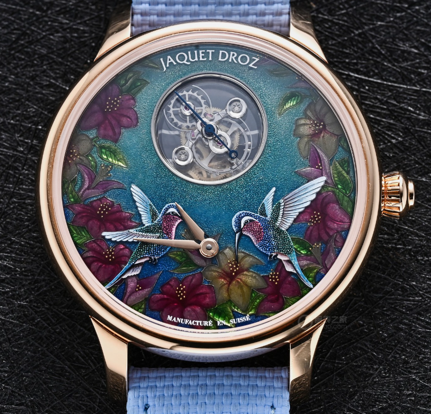 在2022年首次推出的「滾石樂隊」活動人偶,已經成為了雅克德羅活動人偶中的代表作。並在過去幾年中,雅克德羅也推出了多個不同盤面圖案、造型的「滾石樂隊」款式,可以進行定製。 雅克德羅「滾石樂隊」活動人偶,當按下表冠上按鈕後,盤面上唱片似的轉盤,就會開始轉動,並且,轉盤上的「舌頭」也會跟著擺動。唱盤上的「唱針」可以起到活動人偶動力顯示的作用。隨著唱片的旋轉,「唱針」會緩緩落下。當上滿弦「活動人偶